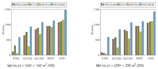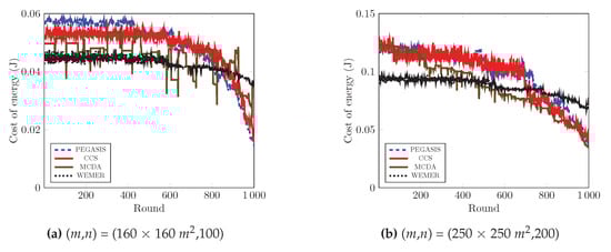 To maximize the lifetime of the network, the energy cost per round is another essential parameter. Figure 21a clearly shows that at round 800, CCS and PEGASIS consumes 0.05 J per round and then the consumed energy abruptly drops as the energy cost of the network is greatly reduced due to the fact that most of the nodes die beyond 800th round. On the other hand, MCDA’s cost per energy is in a zigzag manner, thus, sometimes the network consumes high energy and sometimes low energy. In contrast, the proposed protocol consumes energy in a stable manner. The proper head node selection and wedge merging scheme allows the network to consumes a stable rate and prohibits the sudden death of the network. As shown in Figure 21a and Table 3, the average energy cost of the network is 0.049297 J, 0.0485402 J, and 0.045712 J for PEGASIS, CCS, and MCDA respectively, whereas it is 0.042847 J for the proposed protocol. Furthermore, the maximum energy consumption in any particular round is 0.044642 J for the proposed protocol, in contrast to 0.058585 J. 0.053361 J, and 0.49652 J for PEGASIS, CCS, and MCDA respectively. Besides, Figure 21b and Table 4 demonstrate that the proposed WEMER reduces the energy cost by 12.70%, 11.14%, and 0.82% as compared to PEGASIS, CCS, and MCDA respectively.