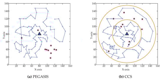 CCS [] is an enhanced of PEGASIS protocol. The main improvement of CCS is that it consider base station position when divide the network into concentric circles. The term concentric clustering means that the shape of a cluster is concentric circles when cluster is formed. CCS improves the delay problem of PEGASIS but there is unbalanced node distribution at each level, which will cause the levels with a small number of nodes to deplete their energy first. Furthermore, during head node selection of each level, energy and distance are not considered which creates unbalanced energy consumption.