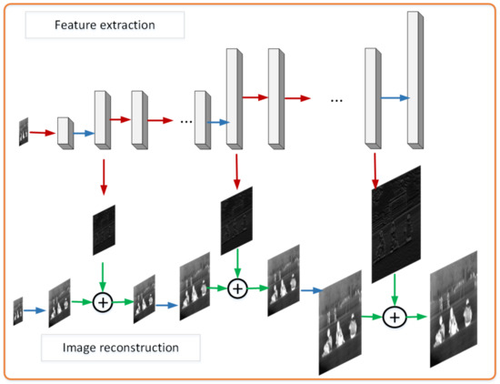 It is superior to other networks in that the proposed model includes sub-pixel layer for upsampling and a guided filtering layer for infrared image denoising. As Figure 3 shows, the features from RGB image is extracted by feature extraction group which concatenates the feature from “convolution” → “Relu” → “convolution” → “Relu” →⋯→ “sub-pixel convolution” → “convolution”. Then, the features from RGB images are added to the reconstruction of infrared images that go through “guided filtering” and “Deconvolution” to up-sampling processing. In this way, each image feature and infrared feature combination will enlarge the image scale by two times. Multi-scales image super-resolution needs to pass the feature to the next level for N feature extraction, and the infrared feature upsampling process, finally completes the reconstruction convolution. The detail information such as the kernel functions, depths and I/O dimensions of all “convs” in “Feature Extraction” and “Image Reconstruction” branches are shown in Table 2.