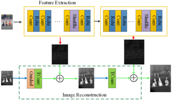 The feature extraction network extracts the visible image features, and upsamples the feature image through the sub-pixel convolution layer, and upsamples infrared image via the transposed convolution in the infrared image reconstruction, and the output image size is twice than the input image. When the super-resolution reconstruction scale is ×2, ×4, and ×8, the sub-pixel upsampling network feature extraction and the infrared image reconstruction upsampling operation are repeated m times (m = 1, 2, 3 ). The upsampling layer extracts image feature via a sub-pixel convolution layer. In each sub-pixel convolution part, the upsampled feature image is twice the size of its former feature image. It is worth noting that the input in the upsampling layer is IR images, and the RGB image is another input in the part of the feature extraction, which gives more detail information compared to handle SR.