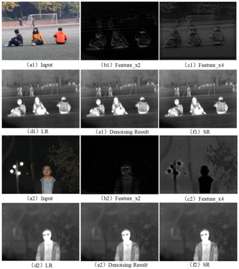 Network-intermediate layer images include feature image ×2, feature image ×4, and denoising results. Two sets of images are listed in Figure 4 which are the images of the middle layer in the proposed network at ×4 scale.
