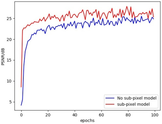 To prove the benefits of sub-pixel convolution, comparative experiments were conducted between networks with transposed convolutions and networks with sub-pixel convolution to improve network performance and rich feature details. As can be seen from the comparison training in Figure 6, the sub-pixel convolution module has always had an absolute advantage over the simple upsampling in training 100 epochs. The sub-pixel upsampling network in the feature extraction model makes full use of sub-pixel convolution. The experiment result shows that sub-pixel convolution is used for image feature extraction, which greatly improves the signal-to-noise ratio (PSNR) of the image.