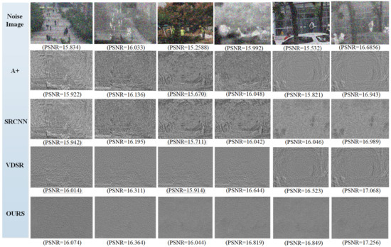 Difference image, which is A+, SRCNN, VDSR, ours SR result subtracting the input noise image. (PSNR values for noise image SR results.)