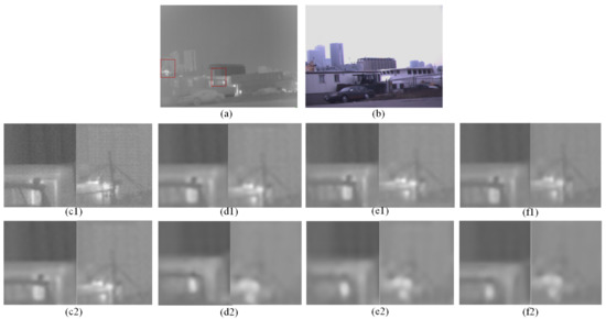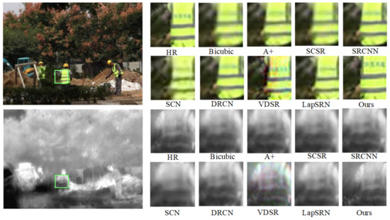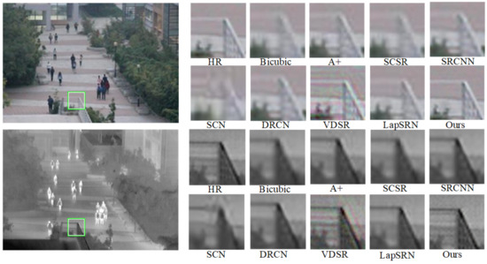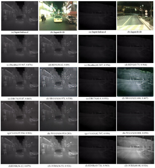 Six pairs of images from KAIST [36] and OutdoorUrban [37] dataset respectively as Figure 13 are chosen for SR experiments on A+, SCSR, SRCNN, DRCN, SRGAN, WGAN, CGAN, and our method. Infrared images and visible images are from two datasets of OutdoorUrban and KAIST. Figure 13a,b are in slightly weak light; Figure 13c,d are in low light; Figure 13e,f are in normal light. The PSNR and SSIM of Figure 13 are in Table 4.