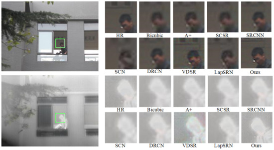 To further highlight the performance of our SR method, a set of images in low light were selected for simulation experiments in Figure 11. OutdoorUrban dataset is images fusion datasets made by Nigel J. W. Morri in the Statistics of Infrared Images [37]. The contrast of the 4× scales experiment is performed by a set of dimly light images using the algorithms Bicubic, DRCN [10], RDN [38], SRGAN [39], CGAN [40] and WGAN [41] and proposed method which embedded the visible features into the infrared image in Figure 12. The PSNR and SSIM of Figure 11 and Figure 12 are shown in Table 4.