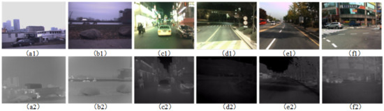 To effectively train the deep network, the database should contain large numbers or different types of images. In this paper, datasets that include IR and RGB images are obtained via two independent cameras, an uncooled long-wave detector IRT102, and Canon 60D. Besides, each pair of RGB and IR image faces the same environment. The data contains images of day and night, usually captured outdoors (gardens, playgrounds, and buildings). For the same scene image, the target size and the resolution of infrared images use the local self-similar-based image registration algorithm [24]. The database (named IR-COLOR2000) captured here consists of thousands of RGB and IR images with different illumination or scene. In particular, several pairs of images are shown in Figure 2.