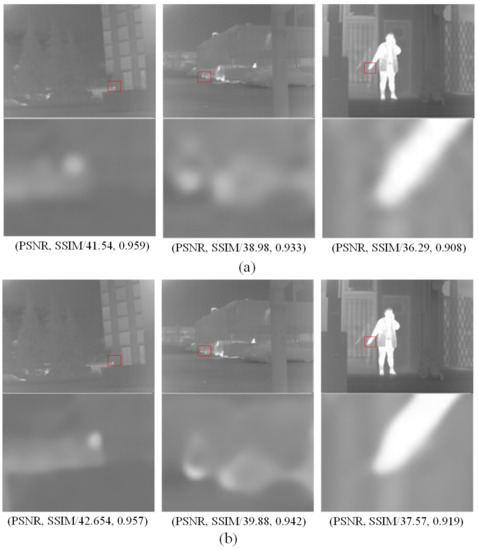 To prove that infrared image noise reduction is effective for super-resolution networks, we conducted an experiment on three pairs of images from the OutdoorUrban [37] dataset. We use the proposed algorithm to reconstruct the above three pairs of images as shown in Figure 14 and calculate the image quality evaluation results. The results without denoising process are shown in Figure 14a and the results with denoising are shown in Figure 14b.