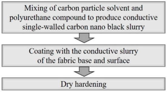 In this study, SWCNT, one of the CPC materials, was selected as the main material for the fabric motion sensor, and a flexible fabric-type joint motion sensor based on this material was implemented by the following method (Figure 1).
