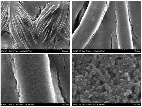 To implement a conductive fabric for joint motion, a conductive and stretchable slurry was made to coat on the base fabric layer. This conductive slurry is composed of single-walled carbon nano black powder (specific surface area 100~200 m2/g), water, urethane emulsion, and other materials. All of these three materials were used to prepare a single-walled carbon nano black slurry. To prepare the single-walled carbon nano black slurry, pure water with 100% weight ratio and carbon nano black powder with 60% weight ratio were measured, dispersed in a tank, and stirred. A urethane emulsion was added to the dispersed slurry at a weight ratio of 25% and further dispersed once more into the continuous type bead mill. A single-walled carbon nano black slurry was added to the knitted fabric (77% polyester/23% spandex) of a base fabric. The fabric was put in a desiccator in a vacuum state, so that the single-walled carbon nano black slurry sufficiently deposited and coated it. The deposited fabric was placed in a dry curing machine (max. 200 °C) and cured at 120 °C for 1 h to complete the preparation for a stretchable and conductive fabric as the material of the fabric motion sensor. The resistance per unit area of the final fabric motion sensor developed through the series of processes was measured. As a result of 10 random measurements of the whole sample, the average resistance per unit area (10 10 cm) was between 280 Ω and 290 Ω, with a standard deviation of 2.5 Ω. Figure 2 shows images of the fabric motion sensor implemented through the above process, taken by a scanning electron microscope S-4800 (HITACHI) at a magnification of 200 to 1,000,000.