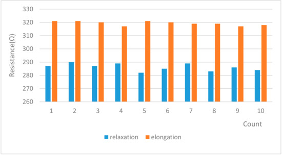 As an experiment for evaluating the sensitivity of the sensor, the elongation and relaxation of the fabric sensor sample fabricated in the rectangular form (100 × 20 (mm)) was repeated 10 times. The results are shown in Figure 4.