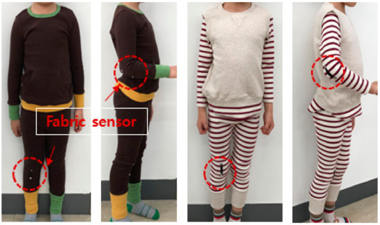 The sensors were fabricated in two shapes, rectangular and boat-shaped and each sensor was integrated into children’s clothing of the same fabric and structure (Figure 3). The rectangular sensor was fabricated with a length and width of 40 mm, 5 mm. On the other hand, the boat-shaped sensor had a length, sensor center width, and both end widths of 40 mm, 10 mm, and 5 mm. The boat-shaped sensor was used in this study in addition to the typical rectangular strain gauge sensor for the following reason. When the limb joint motion is measured through the sensor attached to the garment, the center portion of the fabric sensor is excessively stretched owing to the protrusion of the joint at the time of the motion, while both ends of the sensor may be less stretched. This can cause that the motion signal measured from the sensor generates a lot of noise (TEXTILE MOTION SENSOR, A METHOD OF FABRICATING THE SAME, AND CLOTHING SYSTEM INCLUDING THE SAME / Korean Patent registration number: 10-18956940000, Date of patent registration; 30/08/2018). Therefore, in this study, by deforming the shape of the conventional rectangular strain gauge sensor into a boat type with a wider center, it is possible to attenuate the phenomenon that the center part of the textile motion sensor is overstretched owing to the joint protrusion at joint motion. In other words, we tried to find a way to improve the accuracy of joint motion sensing.