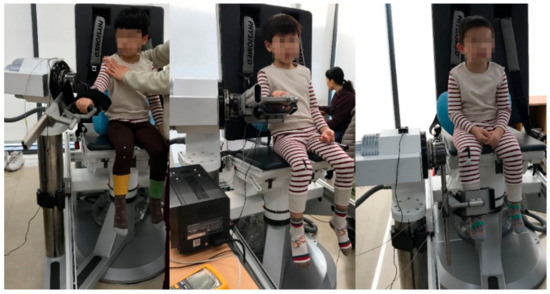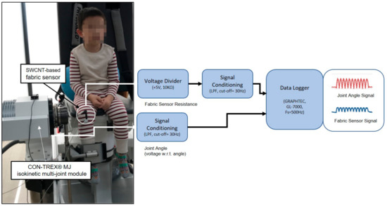 To prevent the children’s individual motion abilities and habits from intervening, a multi-purpose muscle strength measuring device (Con-Trex MJ, CMV AG Co., Switzerland) was used to control the joint motion speed and joint motion range (Figure 6). The measurement circuit was set at 5 V as the reference voltage and at 10 kΩ for fixed resistance. The data output through the fabric sensor at the flexion-extension motion was sampled at intervals of 20 ms via the measuring instrument of the Data Logger (GT342). The experiment setup and signal processing flow was shown in Figure 7.