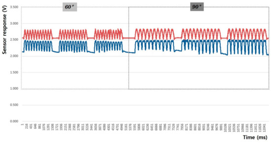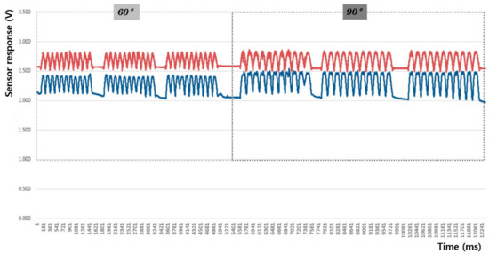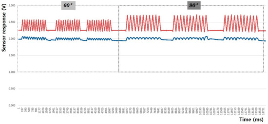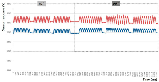 The morphological characteristics of the sensing output graphs of leg motion in Figure 14, Figure 15, Figure 16 and Figure 17 show larger Vp-p than arm motion; however, a double-peak signal appeared at 90° motion angle in all sensor test conditions, regardless of the sensor shape and attachment position. The double-peak signal seems to be related to the sensitivity of the sensor because the fabric sensor was relatively more stretched as the motion angle increased. The area of the sensor attached to the knee area was larger than that of the elbow, and the degree of elongation during 90° flexion-extension of the legs was larger than that at 60°.
