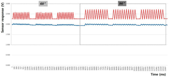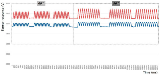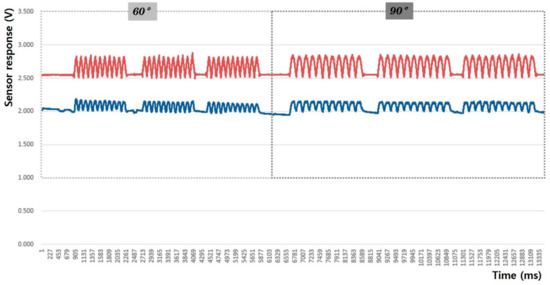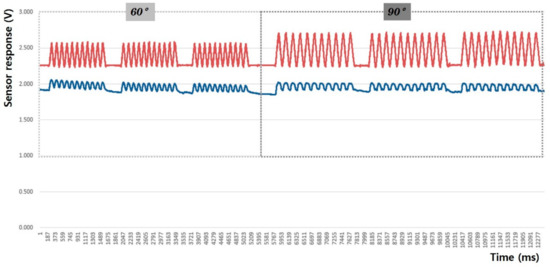 Table 7 and Figure 18 and Figure 19 show the baseline changes during 60° and 90° flexion-extension motion of the leg. The signals obtained showed the smallest deviations during both the 60° and 90° leg motions when the rectangular sensor was attached to the joint; thus, this is the ideal configuration to obtain a signal with low hysteresis and high reliability.