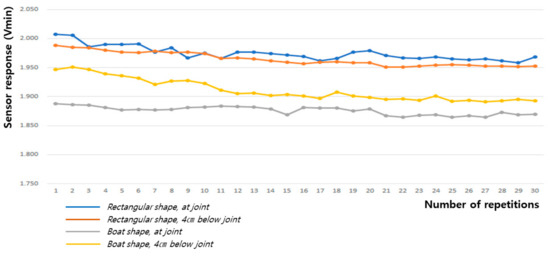 As presented in Table 5 and Table 6, there are significant differences in motion sensing performance depending on the shape of the sensor and attachment position. A more uniform signal was generated when the rectangular sensor was attached 4 cm below the joint, and higher signal reproducibility was obtained. This result shows that the measured motion signal (Vp-p signal amplitude) is smaller when the rectangular sensor was attached 4 cm below the joint, but the sensing result is more reproducible with higher sensing efficiency.
