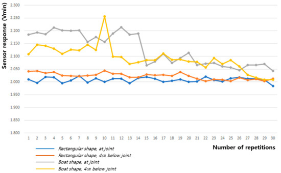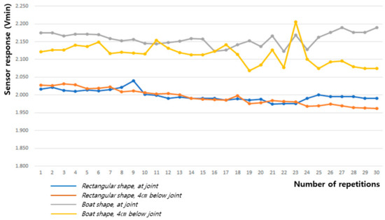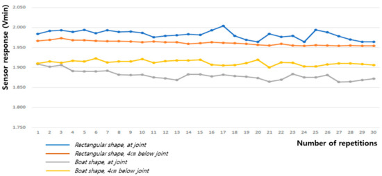 Table 8 and Table 9 present the results of statistical analysis of the clarity of the measured signals through the Vp-p signal magnitude. The signal amplitude was larger in the boat-shaped sensor than in the rectangular sensor, and when the sensor was attached 4 cm below the joint than when attached to the joint. In other words, the boat-shaped sensor attached 4 cm below the joint showed the clearest signal during leg motion.