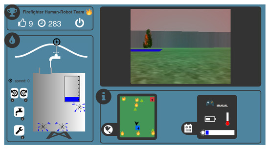 This human–robot mission immerses the human operator in a scenario where s/he plays the role of a remote fireman who has to cooperate with a robot that is evolving in a virtual environment composed with trees that can randomly self-ignite. The goal of the mission is to fight as many fires as possible in a limited amount of time. Through the graphical user interface (GUI) shown in Figure 1, the human operator gets the video streaming from the robot’s camera (top right) as well as the position of the robot in the map (bottom center) and s/he monitors the robot’s internal states, namely, the temperature, the automation level, the battery charge level, and the amount of water in the on-board tank (bottom right). The human operator also has to manage an external water tank (bottom left) during all the mission using the buttons on the left-side of the interface: a tap, which can move horizontally by controlling a wheel (top buttons), fills the external tank when it is in the middle (which is an unstable equilibrium). To actually fill this external tank, the button bellow (black tap) turns on the tap for few seconds. Moreover the participants have to fix water leaks that may randomly occur on this external water tank by using the last button (black wrench).