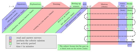 After the end of the four missions, the participants are asked to fill again the KSS survey. The experiment was finalized by checking data records and removing the ECG equipment from the participant. The experimental protocol is summarized in Figure 2. As the participants have to perform four missions, the experiment lasted about 1h30 including training, device set up, surveys, and scenarios.