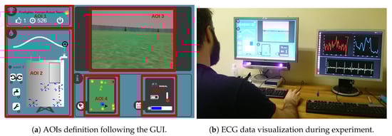 (a) Screenshot of the graphical user interface showing the areas of interest (AOIs) defined for the study; (b) ECG-data acquisition during the experiment.