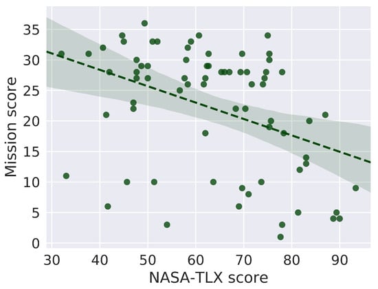 The Spearman’s rank correlation disclosed a significant negative correlation between the NASA-TLX and the global mission score (). Figure 4 plots the final mission score versus the NASA-TLX score for each participant and mission.