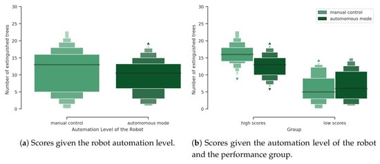 Note that the robot is able to shoot water alone when in autonomous mode. Thus the actual operator’s score contribution relates to the number of fires extinguished when the robot is manually controlled. Figure 5a shows the scores reached considering all missions given the robot automation level. A Wilcoxon test showed that manual control scores are significantly higher then scores in autonomous mode () regardless of the performance group. However, a deeper analysis performed to evaluate the total number of extinguished fires depending on the robot automation level and performance group brought different results. A pairwise Wilcoxon test for multiple comparisons with p-adjustment showed that when the mission is part of the high score mission group, the participants have extinguished more fires in manual control than the robot in autonomous mode (). As expected, during these high score missions, more fires were extinguished than during the low score missions, either in manual control () or in autonomous mode (). Interestingly, for the low score group, the robot extinguished more fires in autonomous mode () than when the human operator was manually controlling the robot (see Figure 5b).