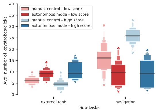 Average number of keystrokes/clicks per sub-task (filling the external tank and driving the robot) during autonomous mode and manual control given performance groups. These graphical representations reappear in the next figures. They show a large number of quantiles, which makes it easier to visualize nonparametric distributions.