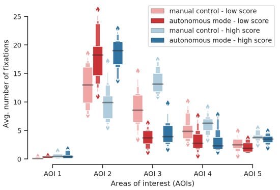 - participants have more fixated AOI 2 in manual control during low score missions () than during high score missions. Note that it possibly demonstrates that these participants kept paying attention to the external tank sub-task instead of taking the robot’s manual control.