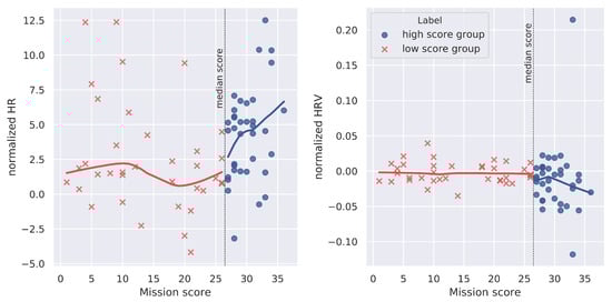 A Wilcoxon test showed that participants have a significantly lower during high score mission than during low score missions (, ). Also, of the participants during high score missions is significantly higher than during low score missions (, ). These markers are illustrated in Figure 8 in function of the mission score.