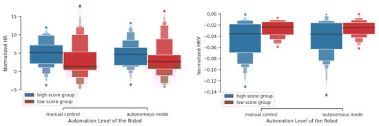 A nonparametric test for multivariate data was performed on averaged ECG features ( and ) computed on 10-s time windows given the robot’s automation level and performance group. A significant effect was found (McKeon approximation for the Lawley Hotelling: ). Post hoc tests show a trend for ( for both automation levels) and ( for both automation levels): the high score group presents a lower and a higher compared to the low score group regardless of the robot’s automation level (cf. Section 3.1; Figure 9).