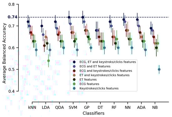The average balanced accuracy and the 95% confidence interval results are illustrated in Figure 10 and summarized in Table 1. Interestingly, the best results found for all classifiers were obtained when all features—ECG, ET and keystrokes/clicks all conditioned on the automation level—were used as input features. The balanced accuracy results ranged from () to (). When keystrokes/clicks features were removed, the results ranged from () to (). When ET features were removed we obtained balanced accuracy results between () and (). Balanced accuracy results ranged between () and () when ECG features were removed. Finally, when each ECG, ET or keystrokes/clicks features conditioned on the automation level of the robot were separately considered, the results were much less attractive.