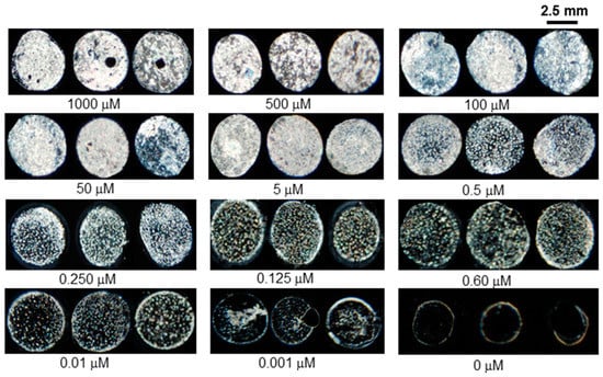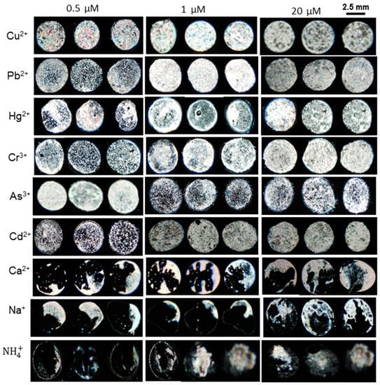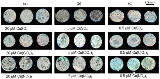 In order to evaluate the aforementioned observations, different copper salts (CuBr2, CuClO4, and Cu(SO4)2) at various concentrations (20 µM, 5 µM, and 0.5 µM) were mixed with 3 µg mL−1 BSA and then immobilized on modified DMOAP surfaces. The optical results shown in Figure 8 for each anionic salt (20 µM, 5 µM, and 0.5 µM) revealed that there is no obvious difference in the optical textures of different anionic salts. Therefore, it was concluded that various anions had no influence on the sensing response of the 3 µg mL−1 BSA probe.