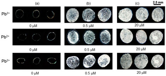 Optical images of LC of immobilized mixtures of Pb2+ (a) 0 µM (b) 0.5 µM and (c) 20 µM with 3 μg mL−1 BSA.