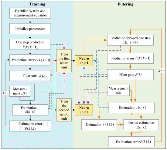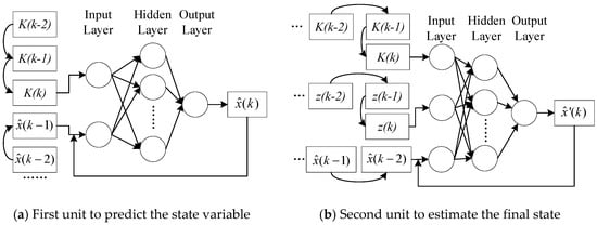 - The filter gain is updated and used to calculate the estimation value with the measurement. Meanwhile, the prediction value, filter gain, and measurement are imported into the second neuro unit to obtain another estimation value.