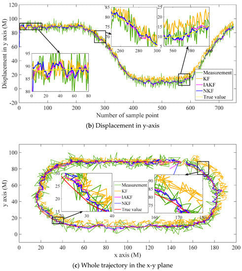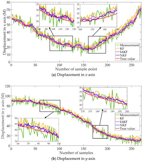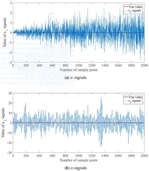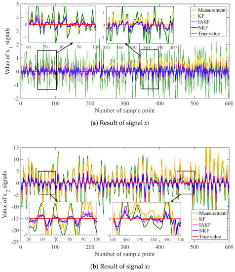 - The primary calculation of the Kalman filter is conducted iteratively following Equations (1)–(7). The measurement vectors are imported into the filter along with time. The intermediate and final values are recorded, including the one-step prediction value, Kalman gain, measurement, estimation result, etc. The recorded values are all labeled with a time stamp. Meanwhile, the iterative steps should be no less than about 150 for the following neuro unit training. The number of sample steps may be adjusted according to the complexity of signals.
