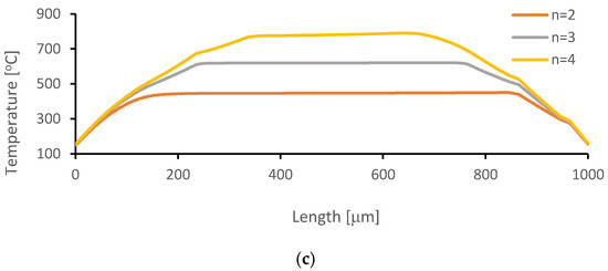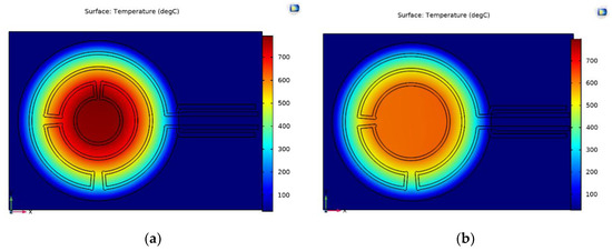 LPCVD is used for deposition of an intrinsic SiC film and a highly doped SiC film. The sheet resistance of the deposited films was measured using the four-point Kelvin measurement. Based on the high difference between the resistivities of the intrinsic SiC (about 440 Ω·cm) and the highly doped SiC layer (ρHIGH = 3.36 × 10−3 Ω·cm) it can be calculated that the current densities in these layers differ by three orders of magnitude. Based on the large separation of the electrical bulk resistivity between the intrinsic and the highly doped version of the poly-SiC layer, it was decided that a passivation layer in between the heater and membrane layers is not necessary, thus favoring fabrication convenience. These values were included in the finite element model (FEM) for analyzing the different heater designs at realistic conditions and the results are shown in Figure 2. The heat loss due to conduction in the membrane and the gas and convection through the fast-flowing gas above the membrane were considered, while the radiation loss was estimated to be much smaller than the conductive loss and was ignored. Moreover, the temperature coefficient of resistivity (TCR) of the undoped SiC is not considered in these simulations. These assumptions limit the validity of the simulations to the lower operating temperature range. The membrane diameter was kept constant at 1000 µm and the temperature profile of a heater with a different number of turns is shown. The width of the wires was 20 µm.