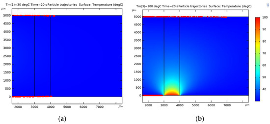 Simulations results on soot deposition distribution with a heater geometry on top of a window membrane of 1000 µm diameter at a position between 3000 μm and 4000 μm at membrane temperatures of 30 °C (a) and 100 °C (b).