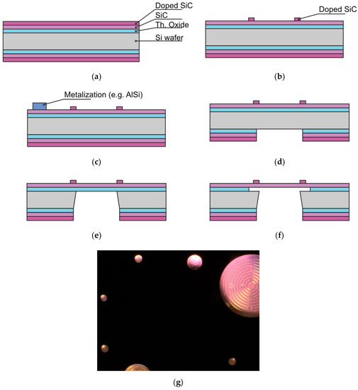 The hardmask on the BS, which is composed of the thermal oxide layer and the two poly-SiC layers, was opened in phases. First backside lithography is performed and the poly-SiC was etched with an Omega ICP etcher. The thermal oxide was subsequently opened using wet-chemical etching with 1:7 buffered hydrofluoric (BHF) etch solution (Figure 4d). The frontside of the wafer was coated with photoresist for protection of the metallization. Etching through the wafers was done with an SPTS Rapier DRIE etcher (Figure 4e). Because both poly-SiC and thermal oxide are transparent in the visible range, visual inspection using an optical microscope with backlight illumination can be used to see which of the membranes are open, see also Figure 4g.