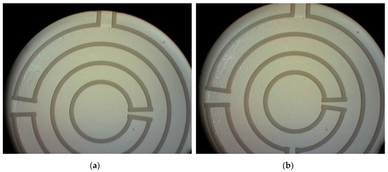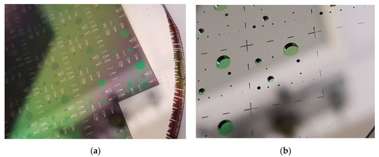 Due to the stress mismatch between the 500 nm poly-SiC membrane (moderately tensile) and the 2 μm thick silicon oxide landing layer (compressive), the membranes are buckled. Therefore, it is important to remove the thermal oxide used as landing layer as soon as possible after through-wafer etching. For the wafers with AlSi (1%) interconnect (IC), the oxide etching was achieved in vapor HF. Four cycles of 300 s each were used to give a successful result as shown in Figure 4f. Figure 5a,b shows respectively the frontside and the backside of the devices after the silicon oxide has been removed. The wafers with aluminum IC were spray-coated after this release step to enable the removal of the dicing foil from the thin membranes in an acetone rinse during final dicing and packaging.
