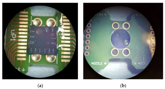Wafers are diced into 10 × 10 mm2 dies and subsequently bonded on a printed circuit board (PCB) with a 9.5 mm hole by using thermal curable glue. The dies are aligned in such a way that all membranes on the die can be simultaneously illuminated and inspected, as shown in Figure 6. Initial experimentation is limited to exhaust gas at room temperatures, which a PCB can withstand. Wire bonding with aluminium wire was applied for the chips with AlSi (1%) IC, whereas bonding with gold wire was used for the chips with Ti IC. UV curable glue was applied below, on and around the bonding wires for mechanical support during transportation and measurements.