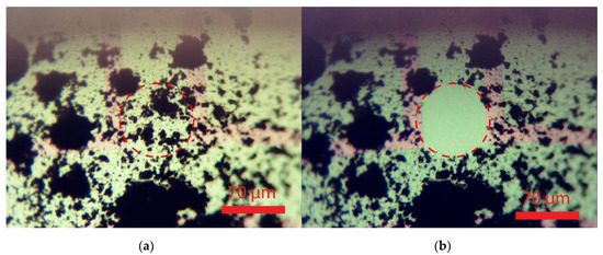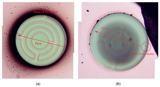 Figure 10a,b shows the images taken from the heated membrane at t = 0 s and t = 70,700 s respectively. As can be concluded from these images, the heated membrane stays clear from soot deposition in case of a temperature gradient between the membrane and the soot-rich gas of around 35 °C. Although this temperature gradient is small, it is shown to be sufficient for an effective repulsion of soot.