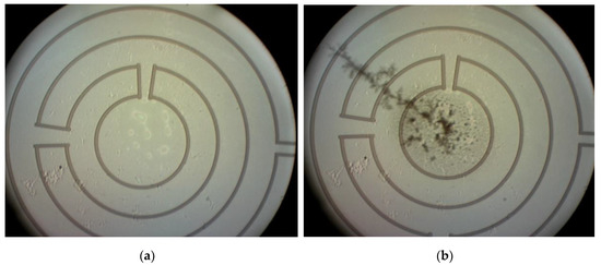 After successfully restoring local transparency at hot spot locations by soot oxidation, the effect of thermophoretic repulsion as an approach for contamination prevention (mode 2 operation) was investigated. Figure 9a,b shows the images taken from the unheated membrane at t = 0 s and t = 70,700 s respectively. Aerosol flow was 100 cm3/min and soot concentration was between 10–12 mg/m3. Soot has been deposited on the backside of the membrane and a large soot dendrite is formed. The soot deposition is by diffusion from a laminar flow, as can be concluded from the soot dendrites in the direction of the flow.