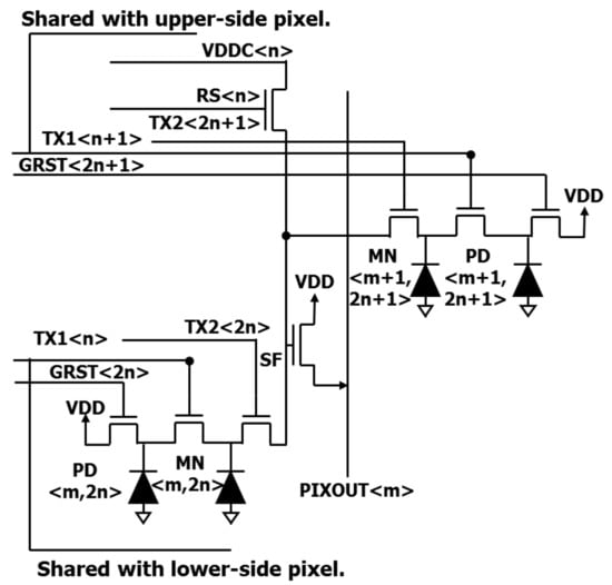 Figure 1 shows the circuit schematic of the developed pixels. In order to maximize the active area, there is no row select transistor by using the floating diffusion drive method [10]. Floating diffusion (FD) is shared by two pixels diagonally. TX1 is served as a control line for both a transfer gate from the PD to MN, and a storage gate over MN, in order to reduce a control line for the storage gate. The control line of TX1 is shared vertically. TX1 maintains a negative bias except during charge transfer from PD to MN. TX2 also maintains a negative bias except during charge transfer from MN to FD. This negative bias accumulates holes at the surface of MN, which occupy recombination centers and prevent carrier generation [11].