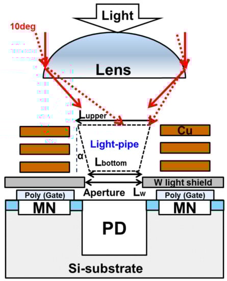 Figure 2 shows the cross-section schematic of the developed pixel. The MN is covered with the W-shield to protect from incident light [12]. The ultra-thin backend process with three Cu layers using a 65 nm process reduced the optical height from the Si surface to the microlens and realized the light pipe (LP) structure using a high refractive index material [13,14], which contributed to the immunity against oblique light. The core material for the LP is SiN. Since the refractive index of SiN is high, incident light is bent at the SiN surface. In addition, incident light into the LP is totally reflected inside the LP by utilizing the difference in refractive index between SiN and the oxide film, and it is confined in the LP, which greatly improved the AR performance.