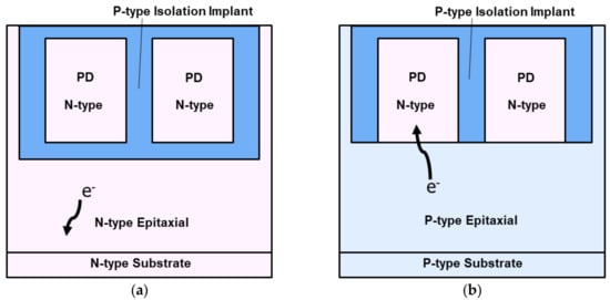 The type of Si substrate can be chosen according to the requirements of NIR performance. Figure 3 shows the simple cross-section schematic for (a) an N-type substrate and (b) a P-type substrate. The N-type substrate is superior to the P-type substrate in terms of dark current performance and MTF, because the PD is better electrically isolated from the adjacent PDs and substrate. The isolation between PD and substrate limits NIR QE with the N-type substrate. On the other hand, NIR QE with the P-type substrate depends on its wafer specifications: the concentration of substrate and epitaxial thickness, because PD is not electrically isolated from substrate. When a P-type concentration of substrate is low, the lifetime of electrons in the substrate will increase, which leads to a much higher NIR QE than that with a high P-type concentration of substrate instead of a higher dark current. Therefore, the p-type substrate is promising in terms of NIR enhancement.