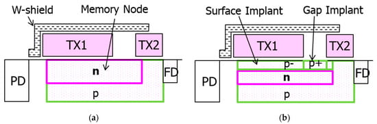 In order to suppress the dark current, we adopted the full pinned MN structure [8,9]. Figure 4 shows the cross-section schematics of (a) conventional MN and (b) full pinned MN. The adopted MN has p-type implants, both under the poly-Si gates, and in the gap between TX1 and TX2, in order to accumulate holes at the surface with negative gate biasing. The surface p-type implant makes the MN’s threshold voltage higher and increases hole accumulation with the negative gate biasing. Due to the lower effectiveness of negative gate biasing in the region in the gap, a high concentration p-type implant to the gap is required in order to accumulate holes in the gap. However, the higher p-type concentration in the gap can make a potential barrier in the gap, which can make it difficult for electrons to transfer from MN to FD. Therefore, the dosage of the p-type implant to the gap should be determined considering FWC and the image lag of the MN.
