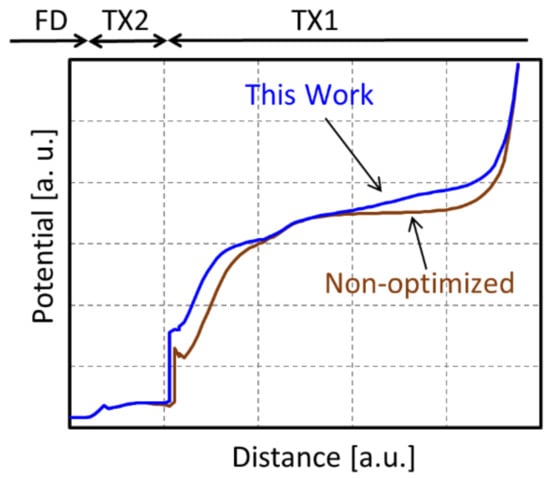 In order to obtain large FWC even with narrow a MN, the MN potential should be kept larger for the entire MN. On the other hand, in order to suppress image lag, the electrical field for transfer from MN to FD should be kept larger. To meet both requirements, we successfully designed implant layouts and conditions for MN so that the potential has a continuous gentle slope from one edge to the other. Figure 5 shows a one-dimensional potential profile of the non-optimized MN and the well-designed MN in this work when TX2 is turned on.