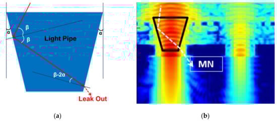 The design guideline for the tapered LP will be described with reference to Figure 6a. When the taper angle is α and the incident angle to LP taper is β, according to Snell’s law, if the first incident angle β is smaller than the critical angle, light will be refracted and leak out of the LP. Therefore, the taper angle α must be small as possible. Considering the multiple reflection, the incident angle to inside the LP decreases as the number of reflections increases. The second reflection angle is 2α smaller than the first reflection angle. Thus, the second reflected light will more easily leak out to the MN than the first reflected light. Figure 6b is a conceptual simulation image. If the LP is long and its taper angle is large, the leak light that enters the MN will increase.