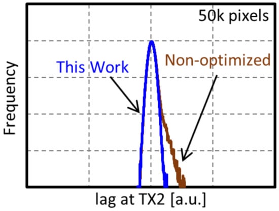 Details of the key performances discussed in Section 3.2 and Section 3.3 are described as follows. First, we discuss MN performances. Figure 10 shows the distribution of image lag at TX2 with the non-optimized MN and the well-designed MN. The MN in this work shows no outlier distribution of lag at TX2, which means that the image lag at TX2 was well suppressed.