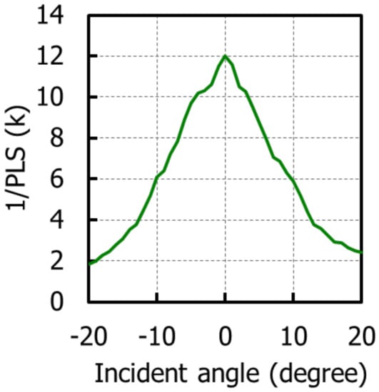 At first, an incident angle of 0 degrees was simulated. The simulation was performed at a wavelength of 530 nm. We would like to emphasize that QE was comparable for all three structures. On the other hand, 1/PLS is greatly affected by the LP shape. Type A had the worst 1/PLS out of the three types. It indicates that a long LP is not appropriate for GS pixels. Type C gave the best 1/PLS.