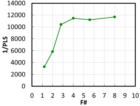 Figure 14 shows the AR of 1/PLS with a green pixel in the horizontal direction, which was maintained at half value or more in the range of ±10 degrees. Figure 15 shows the F# dependence of 1/PLS with a green pixel. 1/PLS was very stable down to F #2.8, and the value was 10,400.